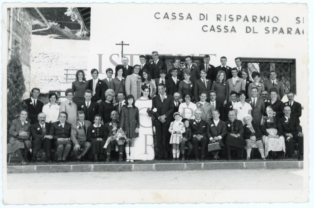 Descriziun: Fotografia de grup dla noza de Maria Tavella de Florino y Lois Dapunt de Sotsas a Badia.