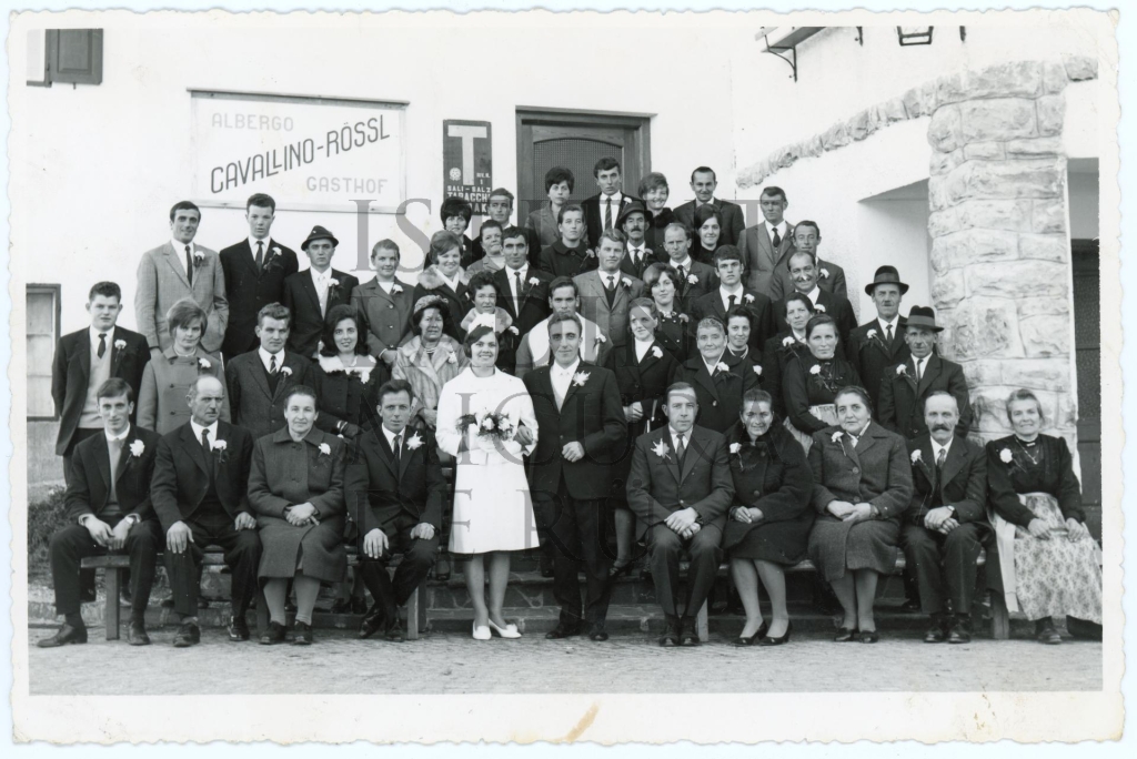 Descriziun: Fotografia de grup dla noza de Ida Leimegger y Sepl Tavella a Badia.