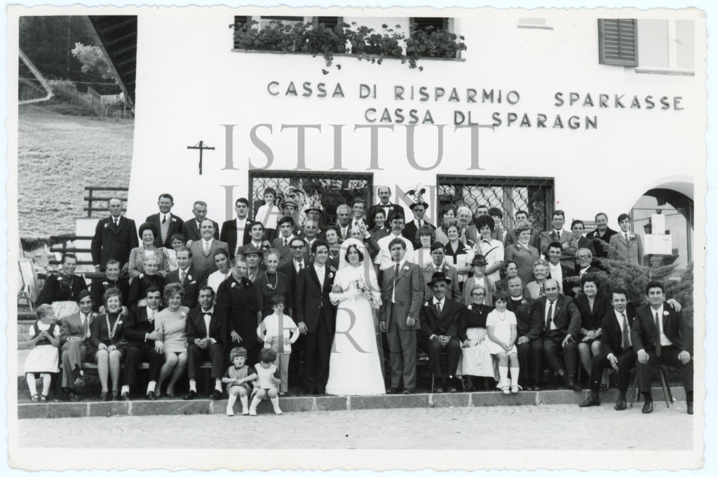 Descriziun: Fotografia de grup dla noza de Ana Anvidalfarëi de Piz y Mauro Marangoni da Trënt a Badia.