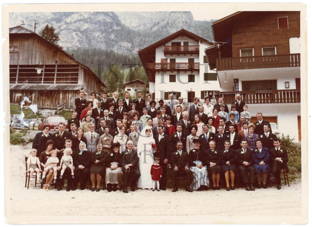Descriziun: Fotografia de grup dla noza de Maria Willeit y Robert Comploj dl Casteller a La Ila.