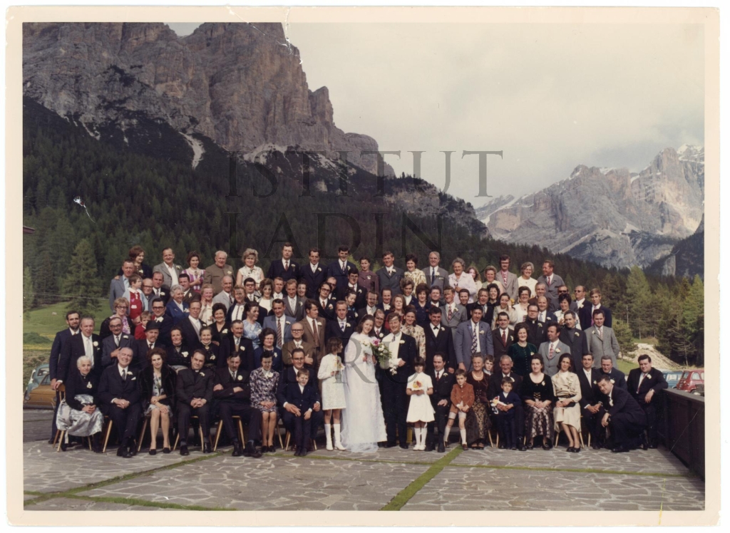 Descriziun: Fotografia de grup dla noza de Waltraud y Franz Wieser dl Hotel Armentarola a S. Ciascian.