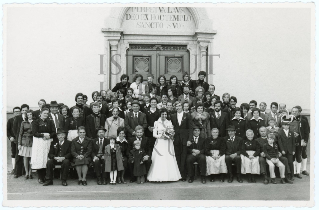 Descriziun: Fotografia de grup dla noza de un di mituns de Pire Miribung y Veneranda Moling da Mirbun a La Val.