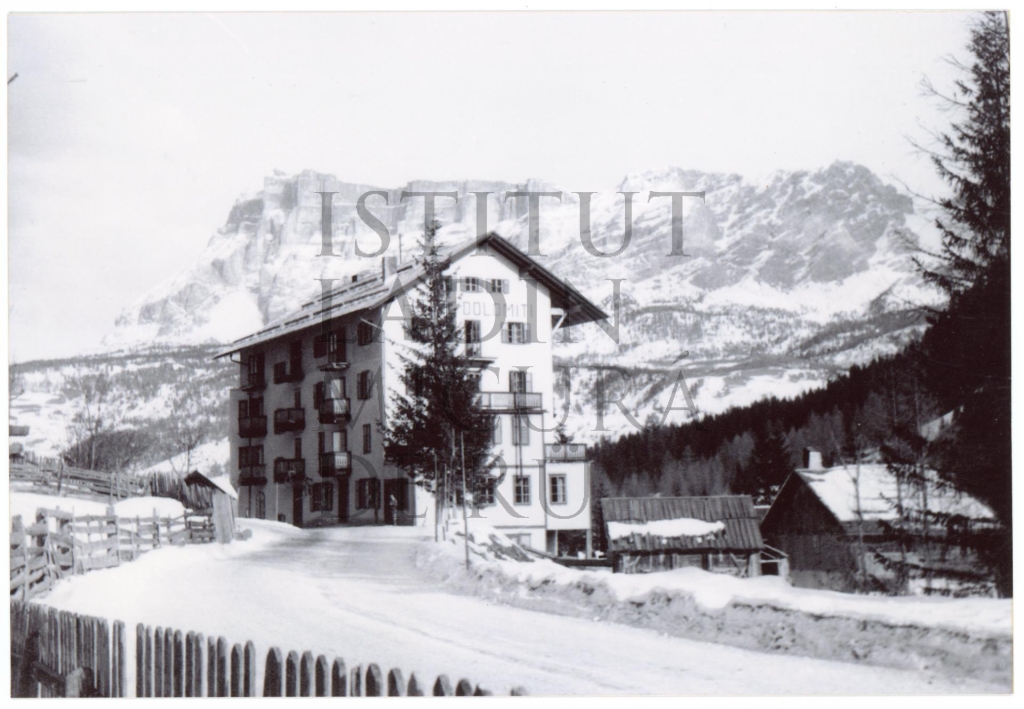 Descriziun: Copia de na fotografia che rapresentëia l'"Hotel Dolomiti" d'invern.
