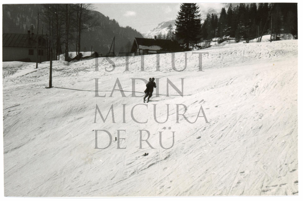 Descriziun: Fotografia che rapresentëia na porsona che vá cui schi cun n möt söl brac.