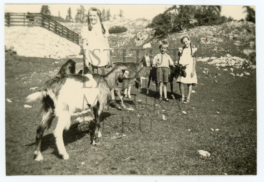 Descriziun: Fotografia che rapresentëia trëi mituns sön Gherdenacia cun les ciores.