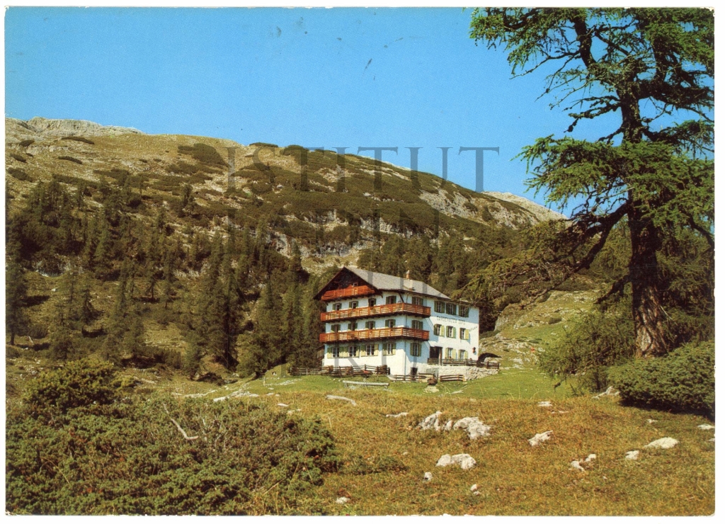 Descriziun: Cherta che rapresentëia la vedla costruziun dla ütia da munt "Gardenacia" d'isté.