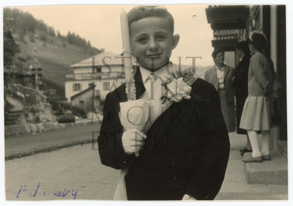Descriziun: Fotografia de Eduard dl Pralongiá le de de süa Pröma Comuniun.
