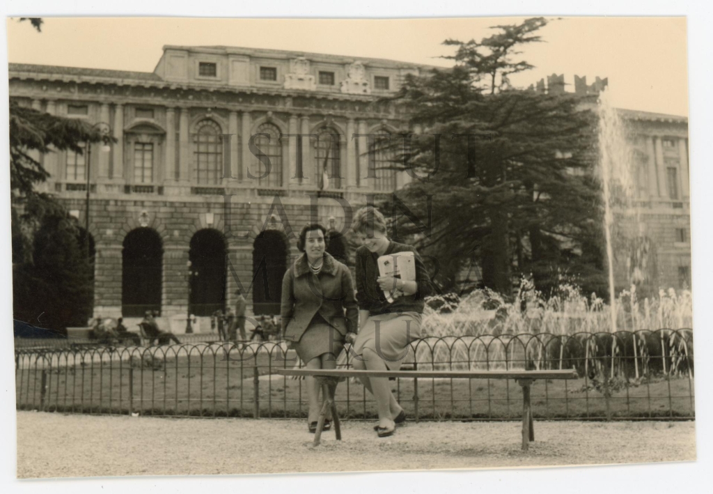 Descriziun: Fotografia che rapresentëia n'ëra y Hilda Crazzolara fates jö dan dal Palazzo della Gran Guardia a Verona.