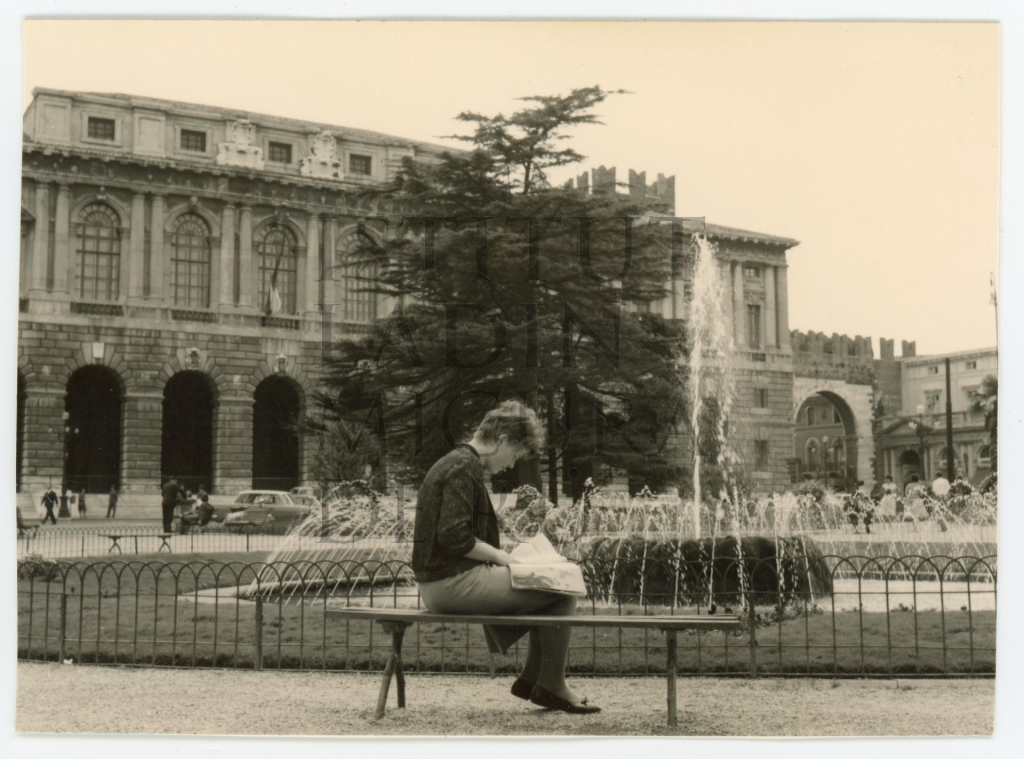 Descriziun: La fotografia mostra Hilda Crazzolara tl laur da lí na revista sentada sön n banch a Piazza Bra a Verona.