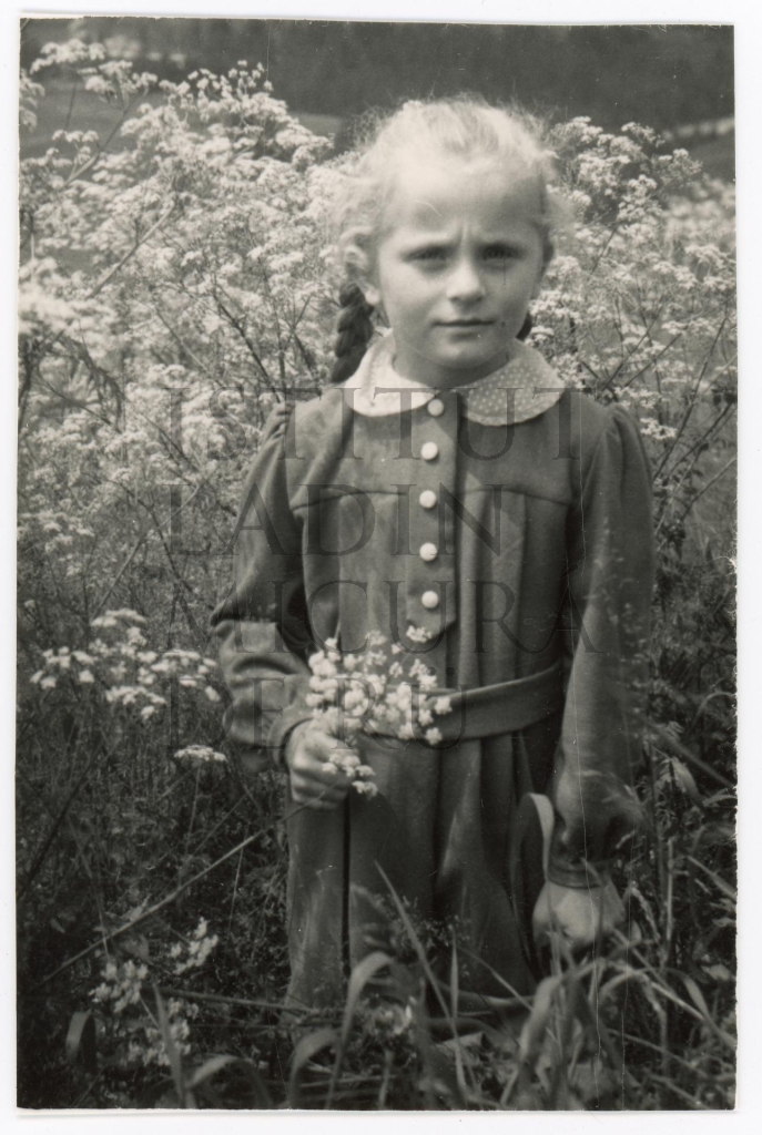 Descriziun: Retrat de Lotti Pescollderungg impé amesa n pre da ciüfs.