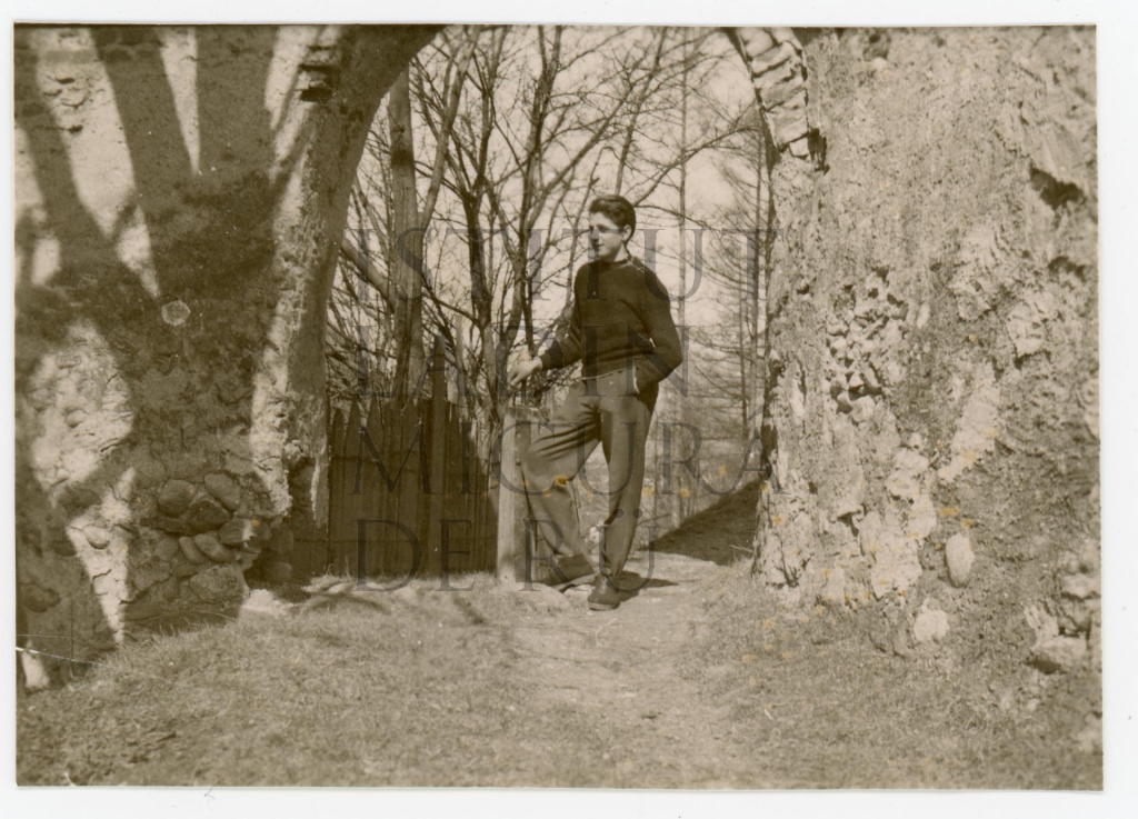 Descriziun: Fotografia che rapresentëia n jonn impé sot a n'arciada de na rovina, bonamënter de n ciastel.
