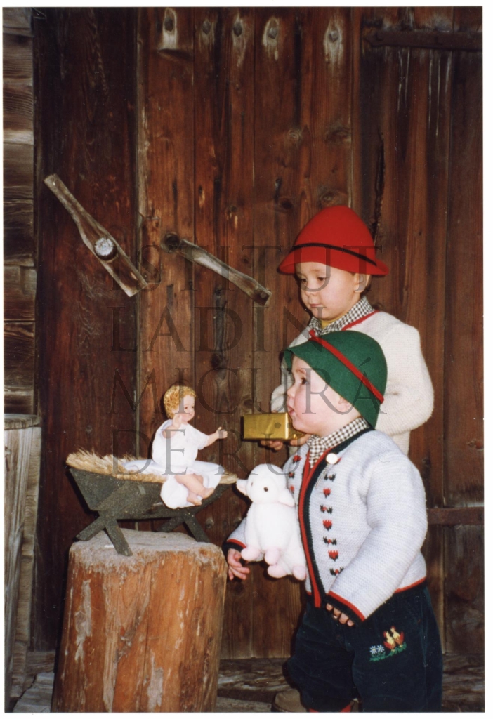 Descriziun: La fotografia rapresentëia Manuel (ciapel cöce) y Maximilian (ciapel vërt) Crazzolara vistis sö da famëis tl laur da porté scincundes al Bambin.