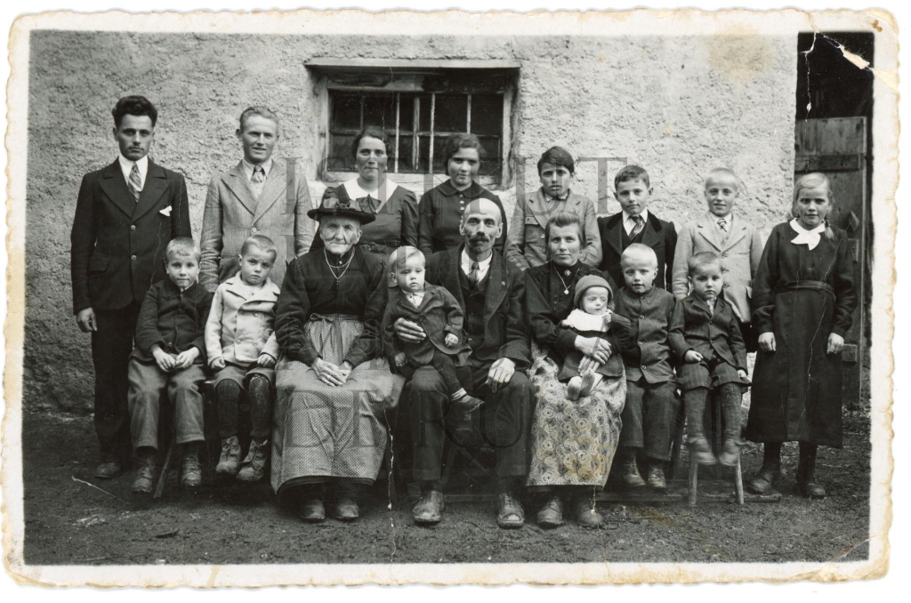 Descriziun: Cherta che rapresentëia na fotografia de grup de na familia, bonamënter podessel ester la familia dl mone d'Alton da Calfosch.