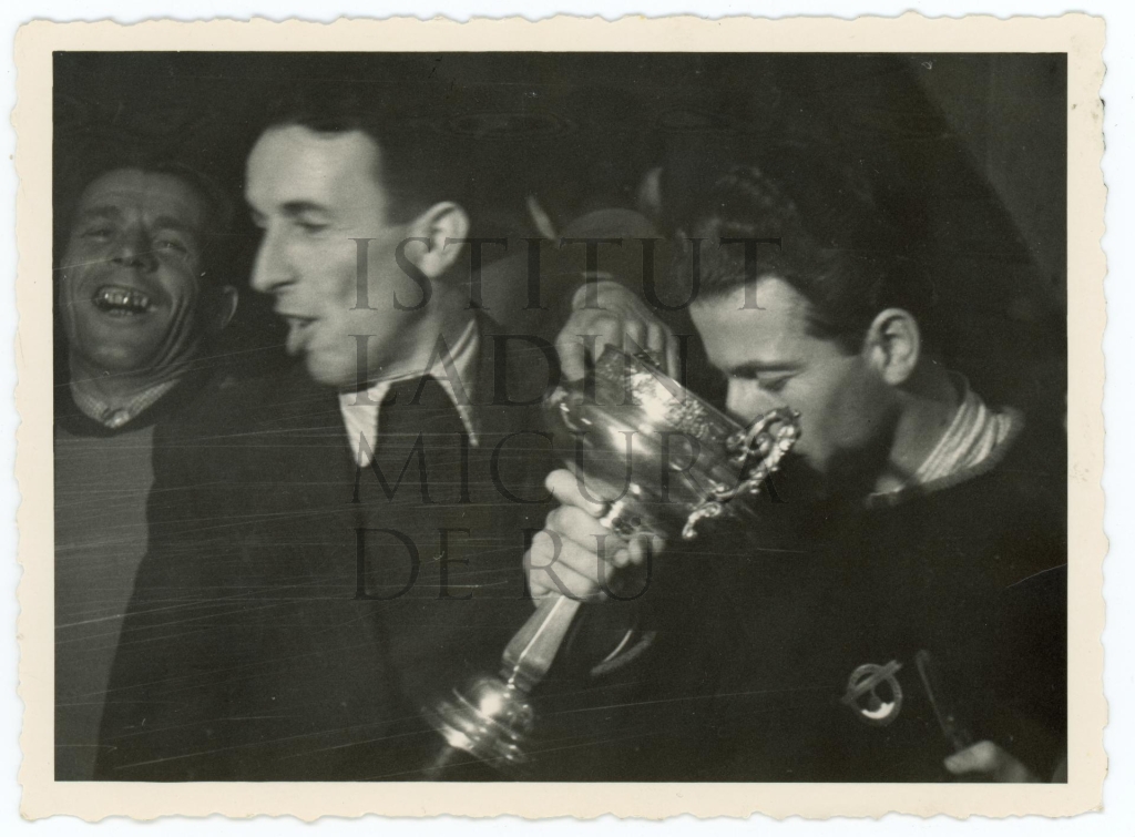 Descriziun: La fotografia mostra n grup d'ëi tl laur da ti la trá sö por festejé na devënta, bonamënter de na gara de schi.
