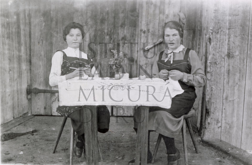 Descriziun: La fotografia rapresentëia Gusta Mangutsch de Rü y Emma Crazzolara da Larjëi tl laur da cují fora.