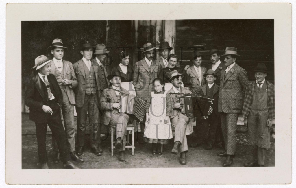 Descriziun: Cherta che rapresentëia n grup de jogn da San Ciascian che fej aurela cörta.