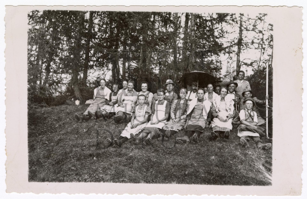 Descriziun: Cherta che rapresentëia n grup de porsones sentades sön n pre; bonamënter él le parenté dla familia Glira.