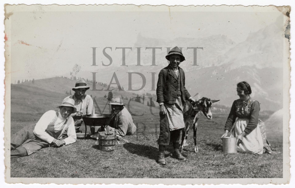 Descriziun: La fotografia rapresentëia jënt da San Ciascian (Agreiter da Ciampidel y Itur) sön munt cun la ciora Celestina y la fana dal scarté.