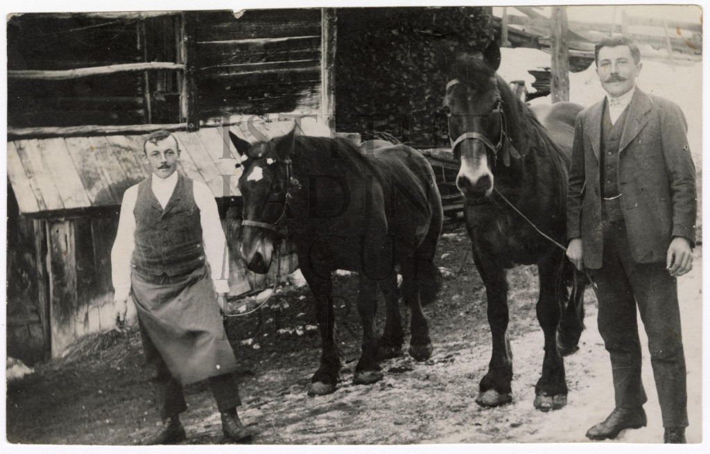 Descriziun: La fotografia rapresentëia i fredesc Giuvani y Gottardo Pescollderungg de La Costa cun dui ciavai Noriker.