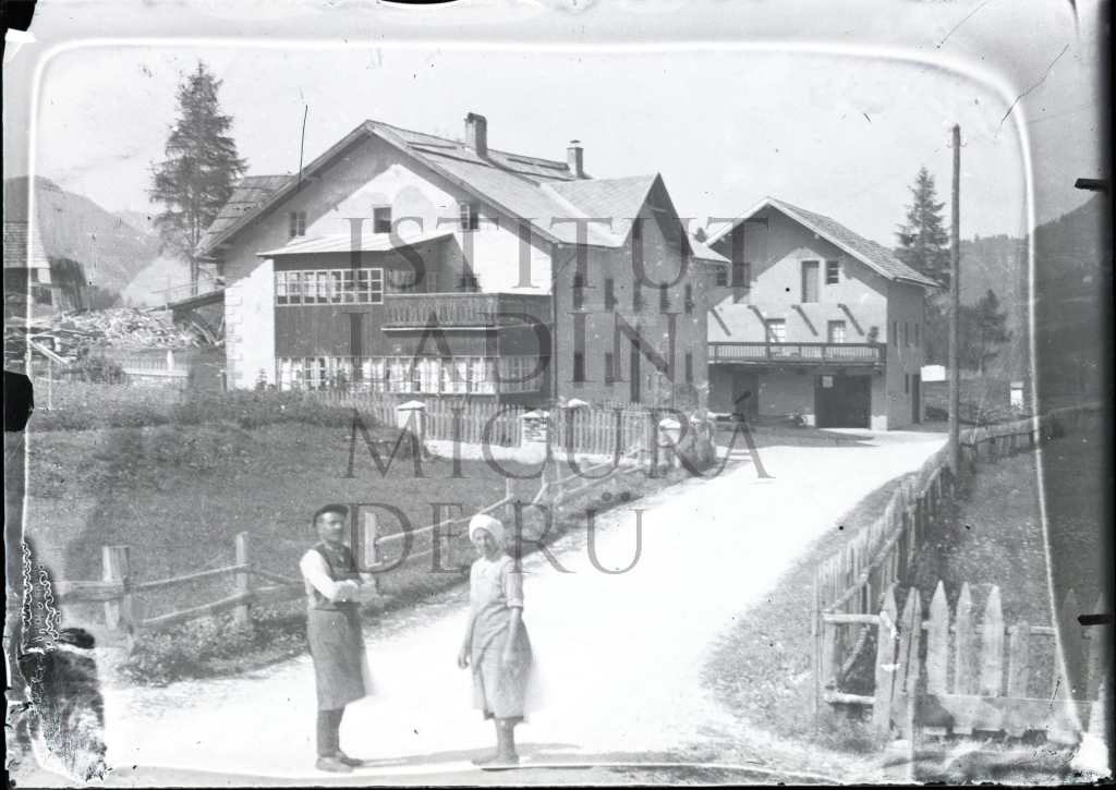 Descriziun: La fotografia rapresentëia döes porsones sön strada dan le frabicat vedl dl Hotel Ladinia a La Ila.