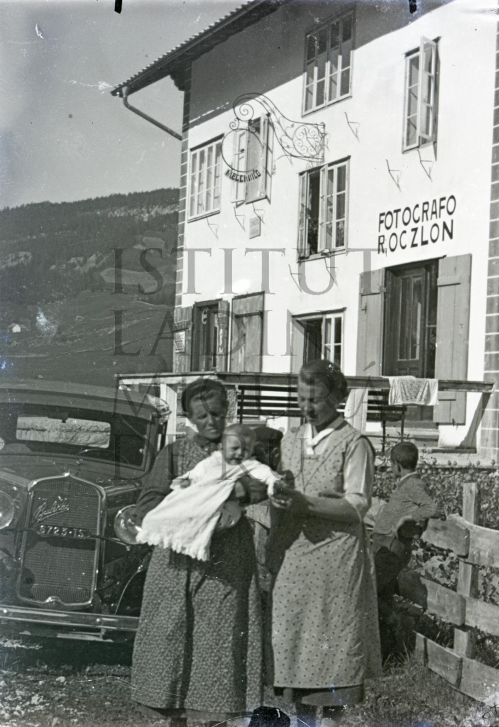 Descriziun: La fotografia rapresentëia Maria Rinna cun süa uma y n pope dan dala botëga dl fotograf Rafael Oczlon a La Ila.