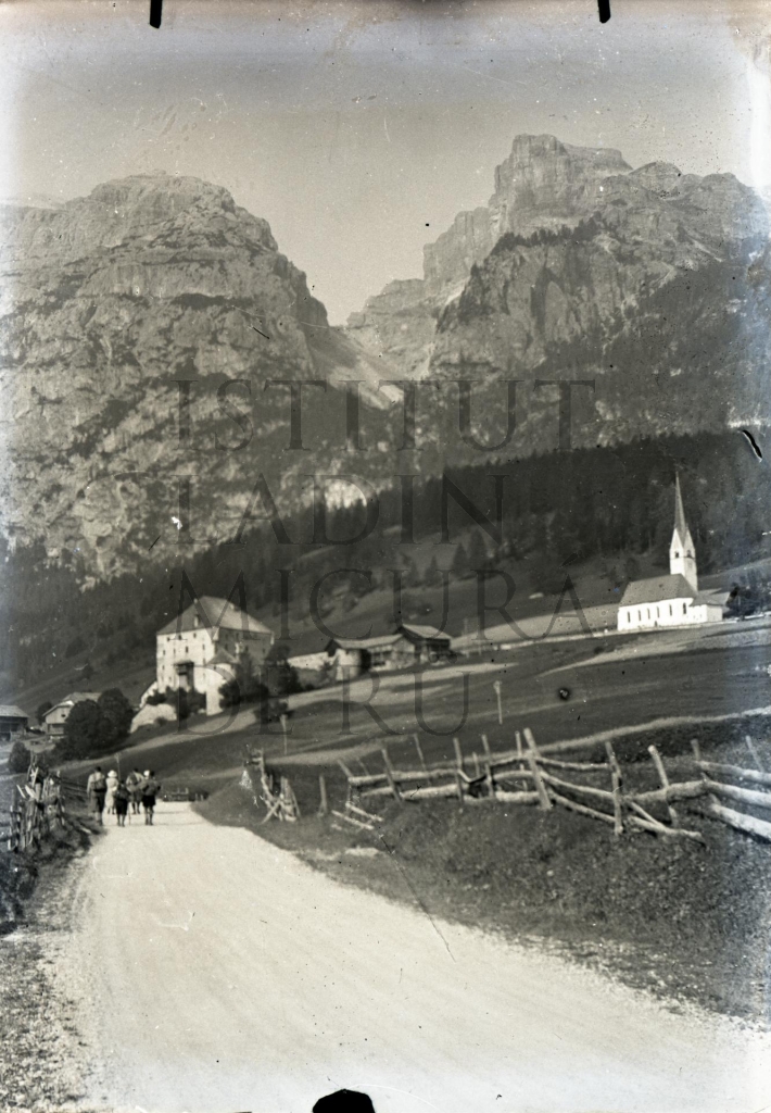 Descriziun: La fotografia rapresentëia la strada da La Ila, cun n valgönes porsones che vá a pe sön strada; doia vëigon le Ciastel Colz y la dlijia.
