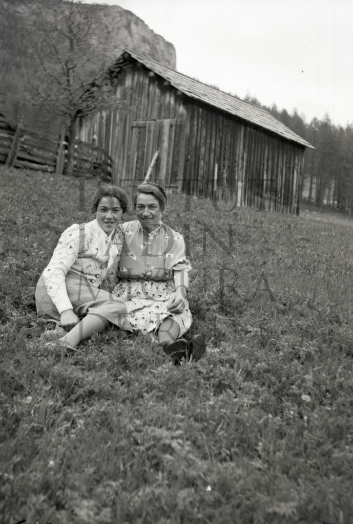 Descriziun: La fotografia rapresentëia les jones Tarina Fistill y Adelaide Declara da La Ila sentades te n pre.