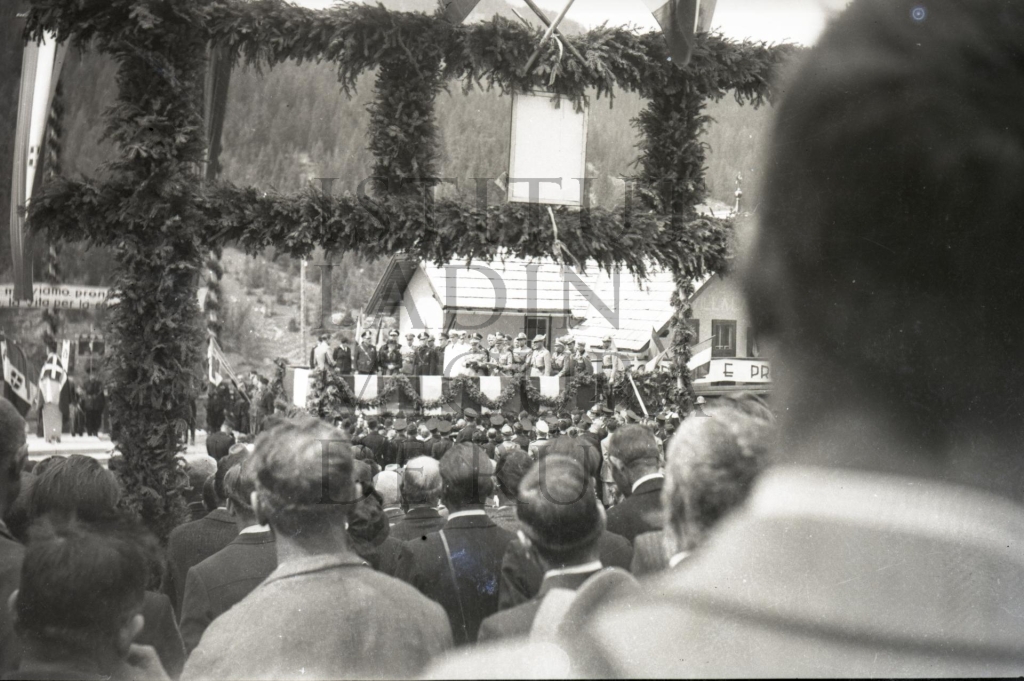 La fotografia rapresentëia, n pü' da dalunc, le palch dles autorités che â tut pert al'inauguraziun dl monumënt dediché a Giuvani Ruazzi; danter chëstes autorités êl ince le Prefet de Balsan Agostino ...