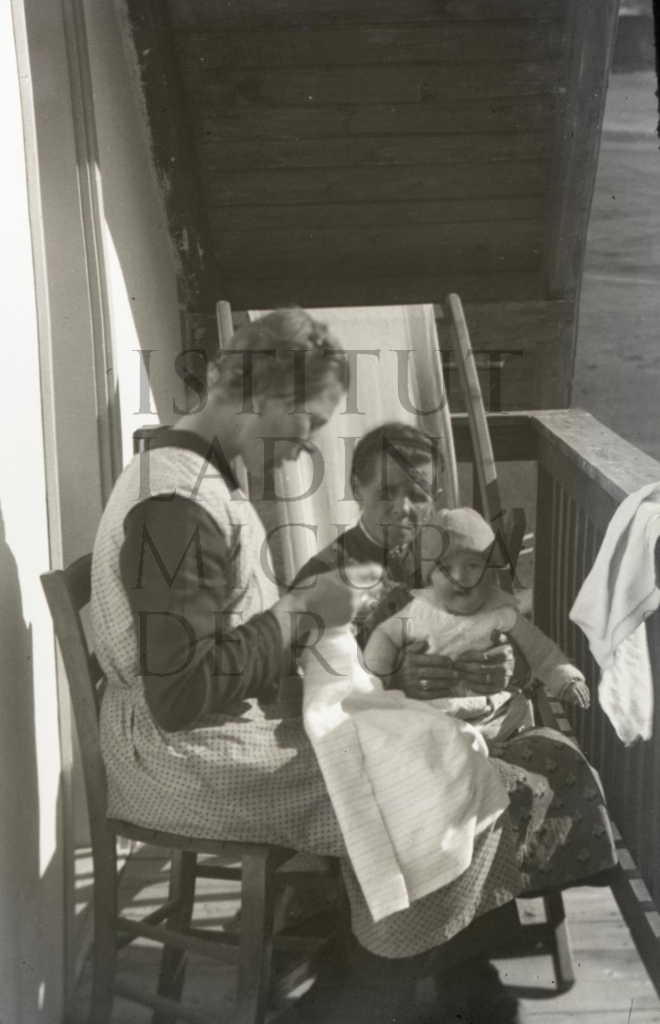 Descriziun: La fotografia rapresentëia Maria Rinna tl laur da cují, adöm a süa uma y a so pope.