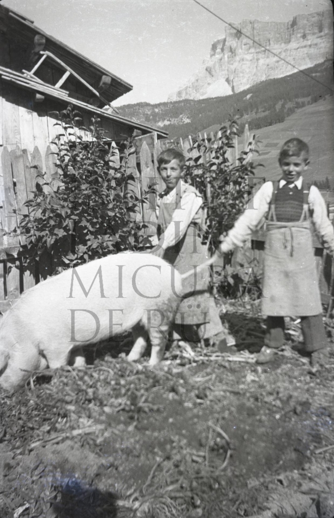 Descriziun: La fotografia rapresentëia i dui fredesc Sepl y Giuvani Dapunt, adöm a n porcel sön la vila da Sotsas a La Ila.