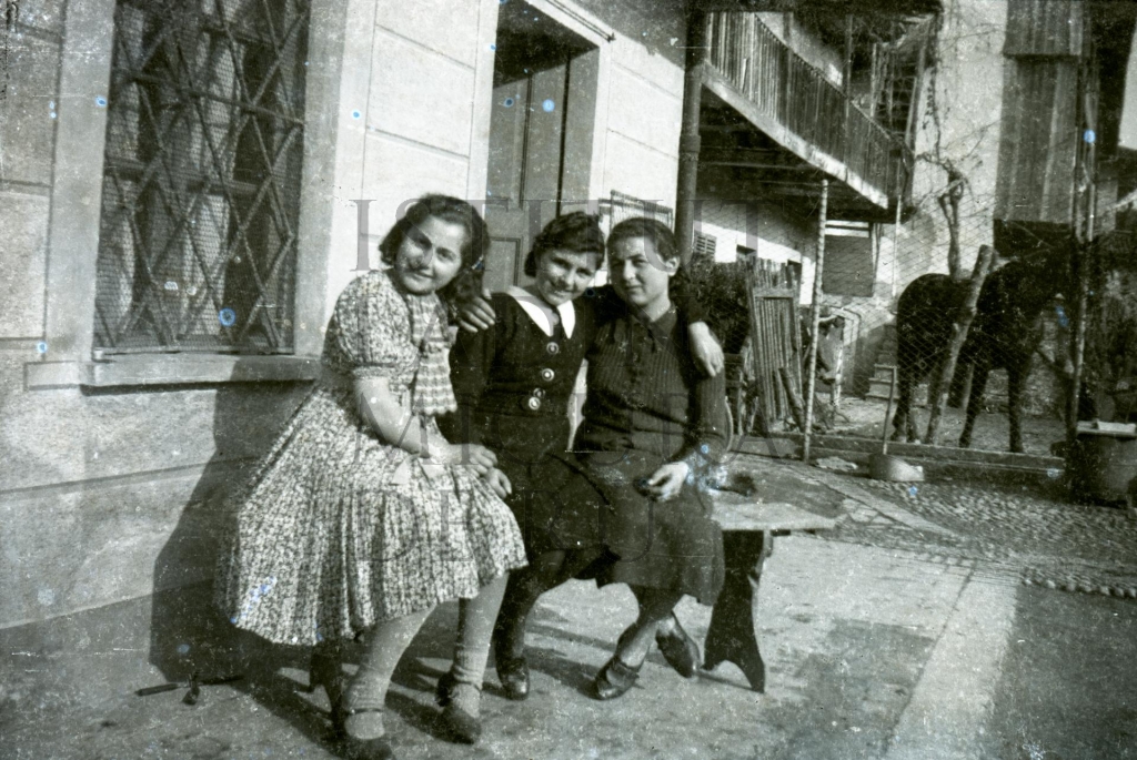 Descriziun: La fotografia mostra trëi jones sentades sön n banch dan da na ciasa; doia vëigon ince n ciaval.