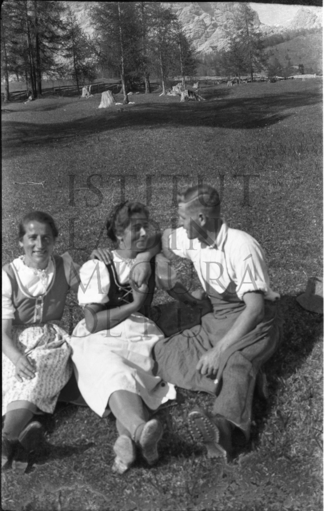 La fotografia mostra trëi jogn, bonamënter düc da San Ciascian, sentá sön n pre. (vijo_rottonara_la_ila_209)