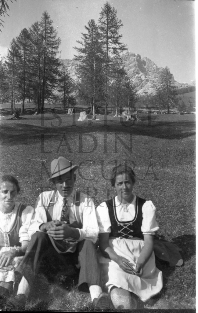 Le retrat mostra da man dërta Maria Agreiter, Franzl Crazzolara y n atra jona sentá sön n pre. (vijo_rottonara_la_ila_215)