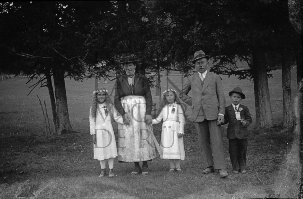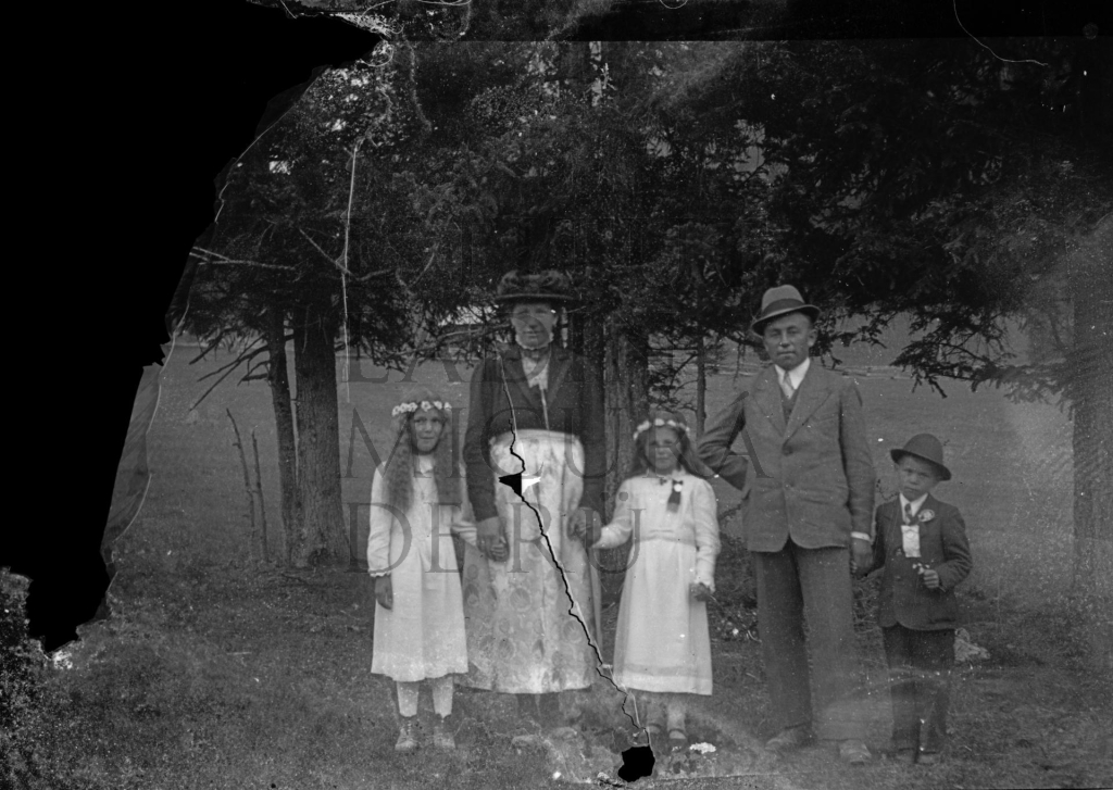 Descriziun: La fotografia mostra döes crejimandes adöm ala tota Angela Canins y le crejimant Iaco Granruaz adöm al tot Paul Costamoling.
