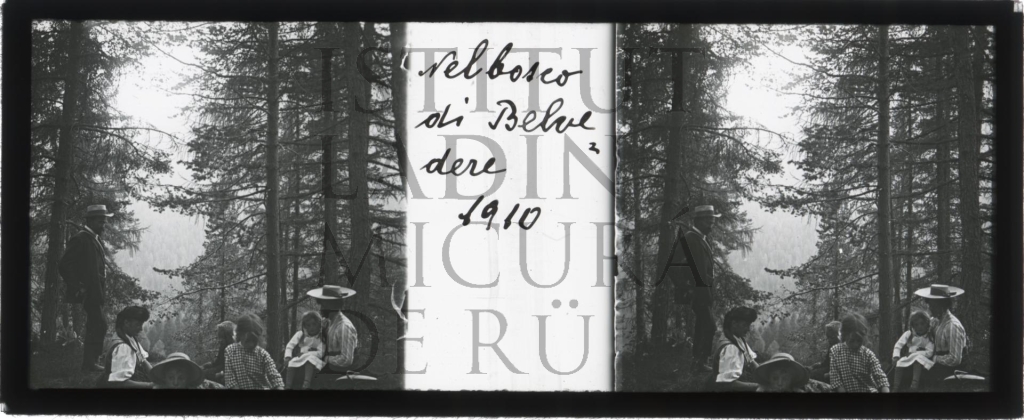 Descriziun: Fotografia dla familia Zardini tl bosch dl Belvedere a Pocol, sura Cortina. Impé sön la man ciampa él Raffaele Zardini, le rest dla familia é sentada sön pre. Bonamënter se tratel de na roda dla domënia.