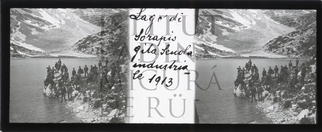 Descriziun: La fotografia mostra n gran grup de porsones metüdes sö sön la spona dl lech dl Sorapis. Al se trata de la jita dla "scora industriala" da Cortina, chëra che deventará spo la scora d'ert, conesciüda suradöt por la seziun de filigrana y de laur ziplé.