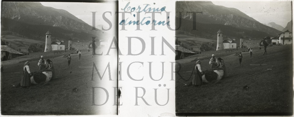 Descriziun: Sön la fotografia vëigon deplö porsones sön i pra de Majon, na fraziun de Cortina, tl laur da trá adöm le fëgn. Les ëres cöi adöm le fën t'i linzôs y i ëi se ciaria chisc sön le spiné y i porta demez. Les ëre á indos le guant ampezan.