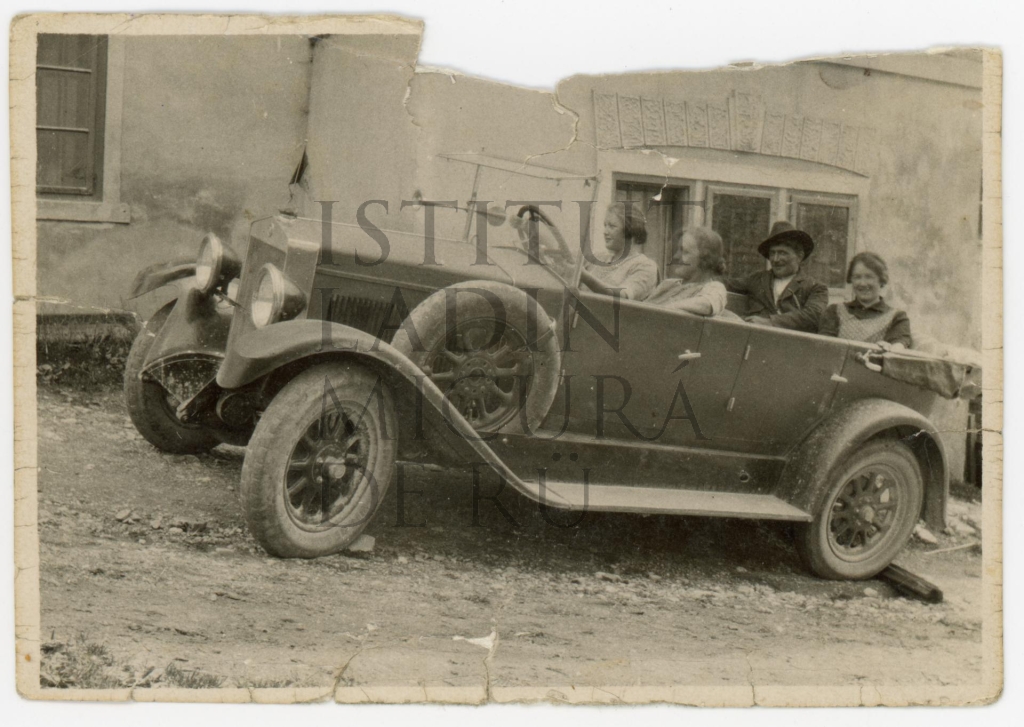 Descriziun: Retrat che mostra cater jogn da Picolin/San Martin sentá te n auto dan dal'ostaria Posta a Picolin.
