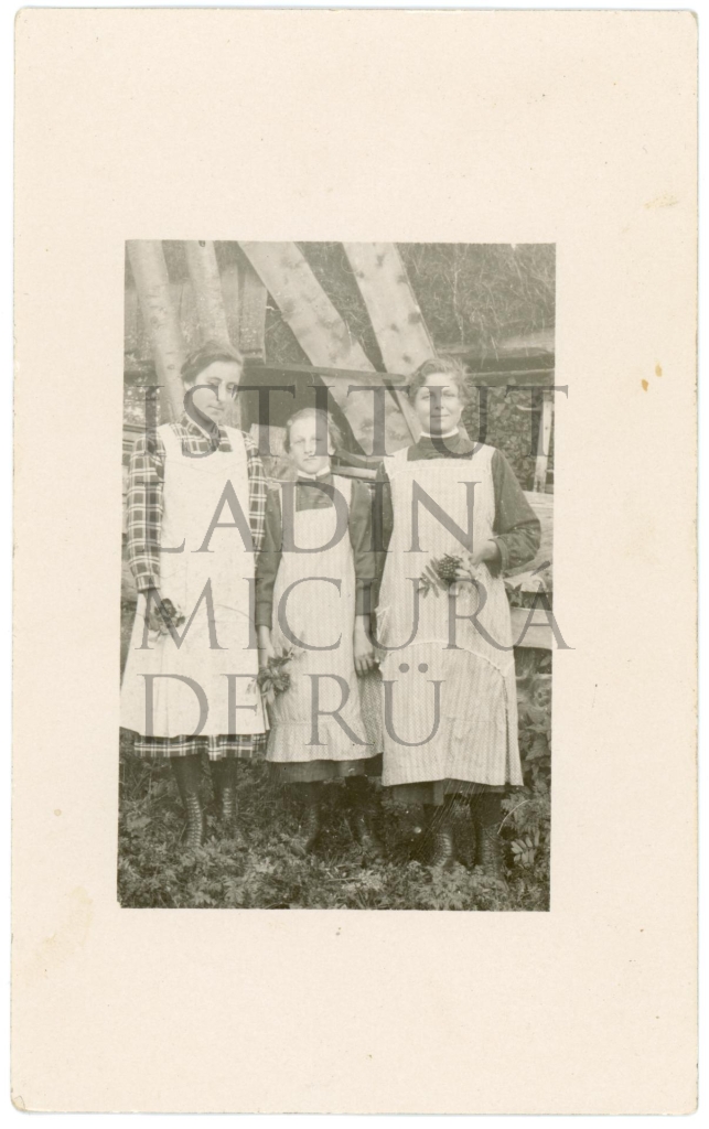 Descriziun: Cherta che rapresentëia trëi jones, bonamënter sorus, che ê stades a cöie poma.