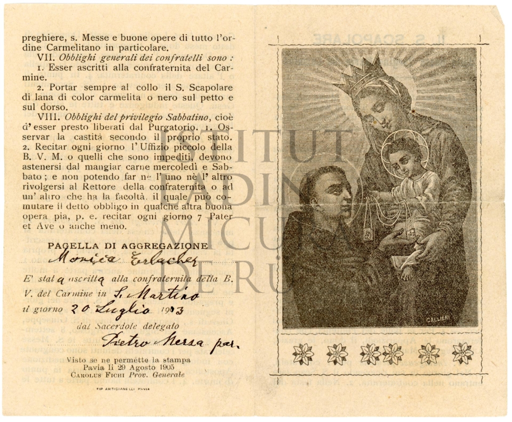 Descriziun: Atestat d'agregaziun de Maria y Anna Erlacher ala confraterinité "S. Scaporale della Beata Vergine Maria del Carmine".