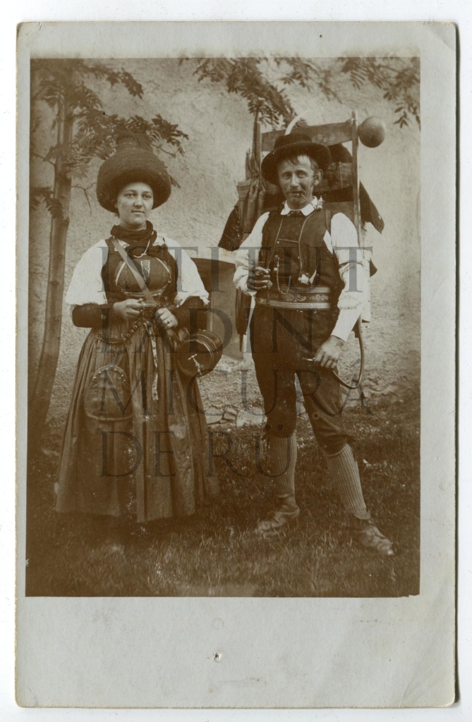 Descriziun: Cherta che mostra bonamënter n cramer/trogher nia badiot adöm a n'ëra vistida cun la troht da d'invern dla Val Badia.