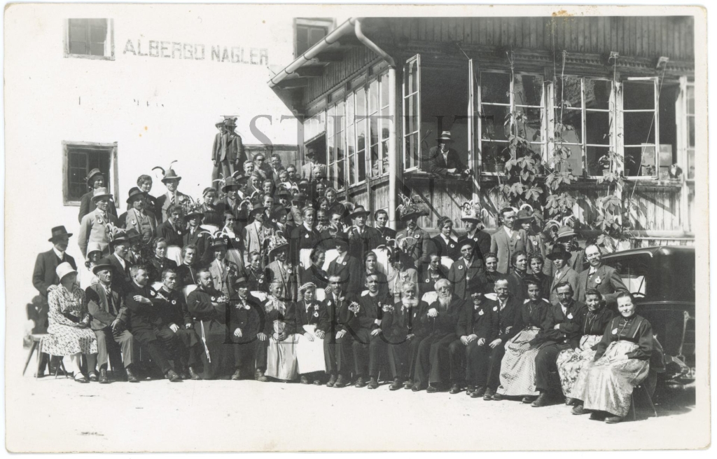 Descriziun: Fotografia de grup tuta sö dan le "Albergo Nagler" en gaujiun dla noza de Paul Pizzinini de Costa, un di fredesc de Siur Ujöp Pizzinini.