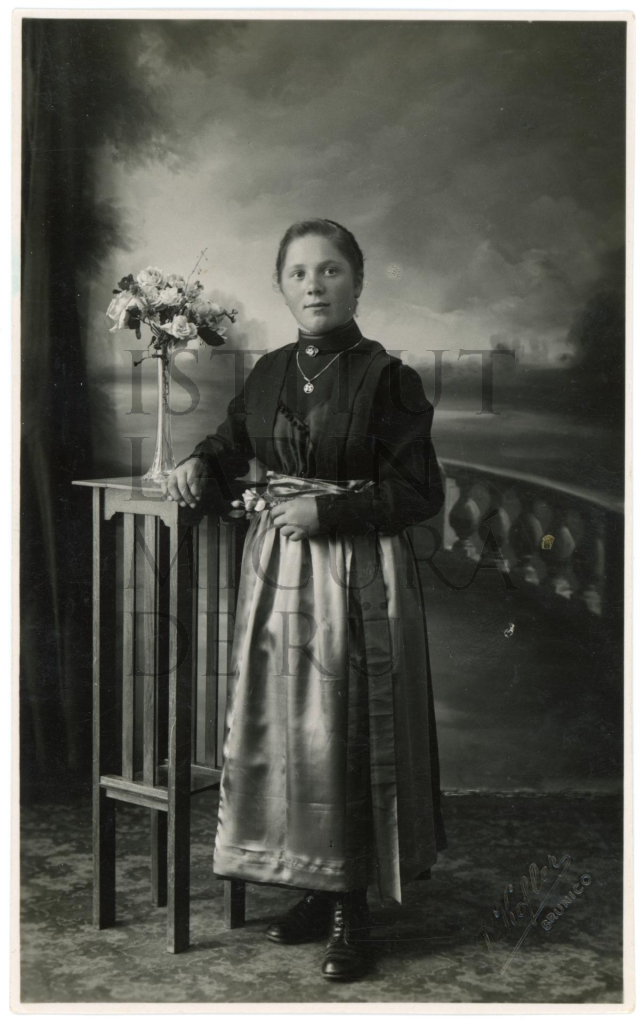 Descriziun: Le retrat mostra na jona dla Val Badia che se lascia fá jö tl stüde fotografich D. Kofler a Bornech.