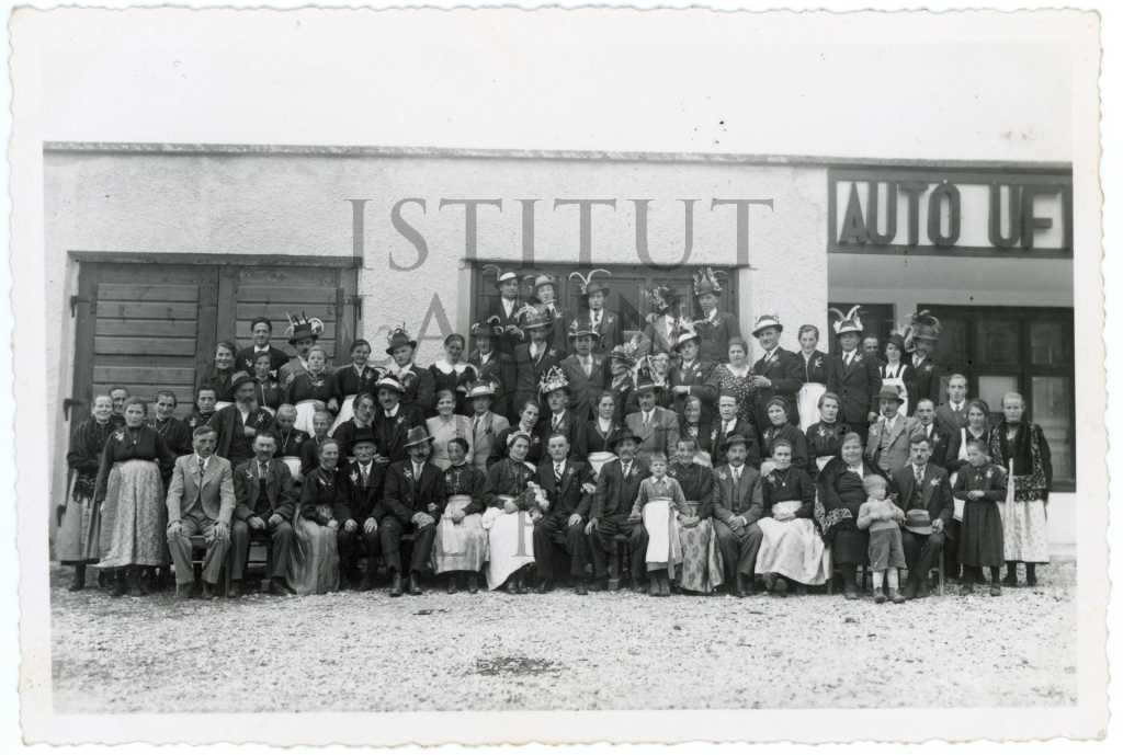 Descriziun: Fotografia de grup tuta sö en gaujiun dla noza de Giuvana Fistill (?) y Iaco Frenademez da Dlira.
