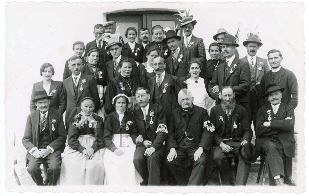 Descriziun: Fotografia de grup tuta sö en gaujiun dla noze de Maria Canins de Lenz y Pire Pescoller.