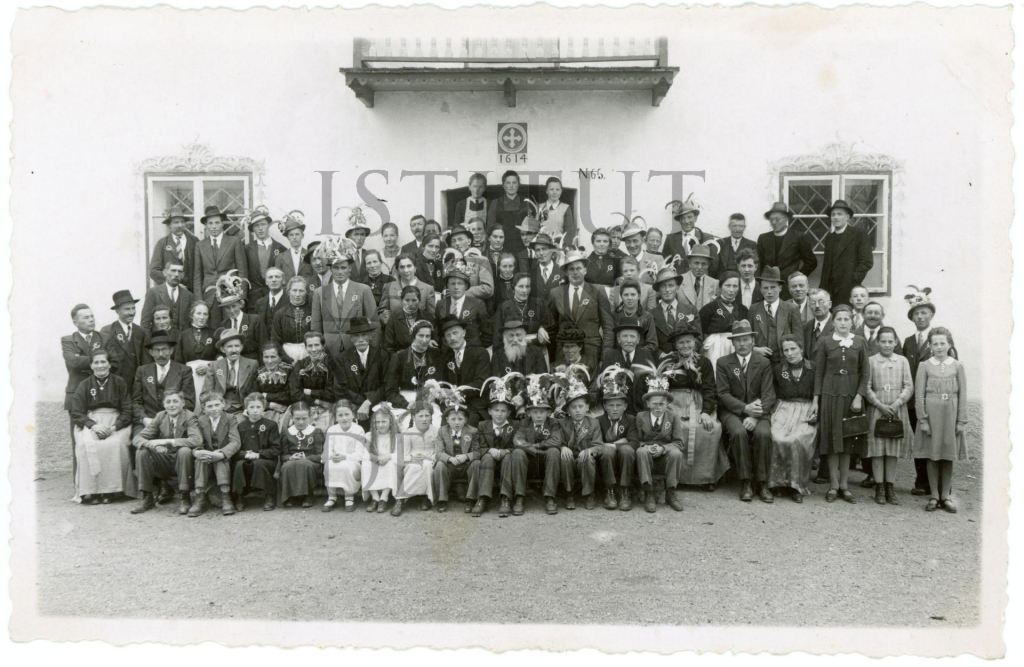 Descriziun: Fotografia de grup tuta sö en gaujiun dla noza de Zilia Irsara de Pescol y Vijo Castlunger de Sompunt.