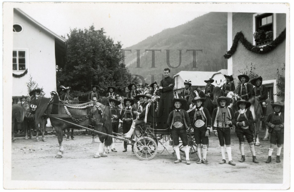 Descriziun: Le retrat mostra le primiziant Erminio Pizzinini de Severino sön n ciar adöm a n grup d'ëi che vist la troht da scizeri; bonamënter ési a Sëlva, deache Erminio é nasciü a Sëlva da geniturs da La Ila, mo é spo gnü chersciü sö sön le lüch da Mulin a Plan de Sëlva.