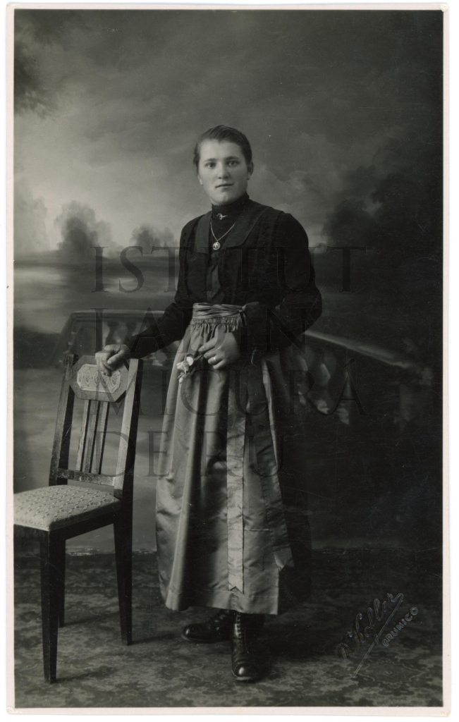 Descriziun: Le retrat mostra na jona che se lascia fá jö tl stüde fotografich de David Kofler a Bornech.