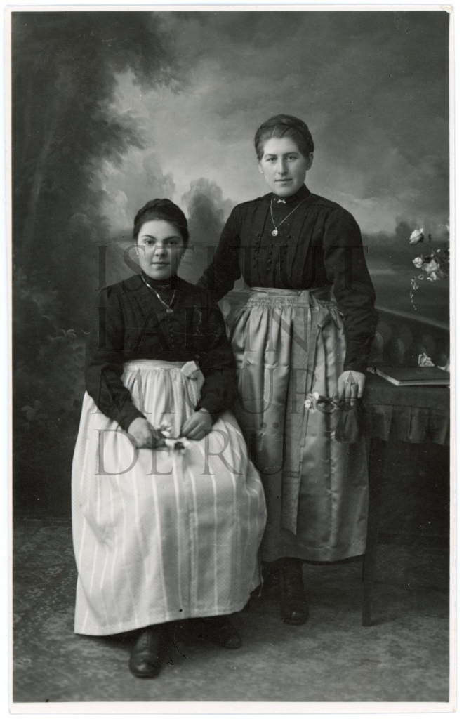 Descriziun: Le retrat mostra döes jones metüdes sö por se lascé fá jö tl stüde fotografich de David Kofler a Bornech.