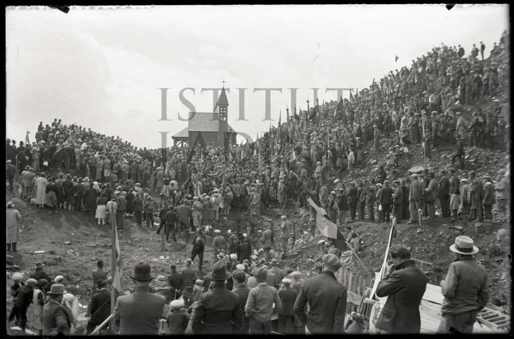Descriziun: Retrat tut sö tratan l'inaudaziun dla "Capela dla Pesc" sön Col de Lana ai 18 d'agost dl 1935.